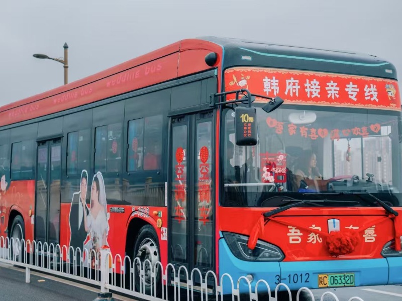 10月20日,三辆原本平凡的公交车被精心装饰一新,缓缓驶入人们的视线。陈仓区妇幼保健医院护士新娘杨岚和新郎韩阳一场别开生面的婚礼吸引了众多市民的目光。一对独具创意的新人,以公交车为婚车,开启了他们浪漫而又特别的新婚之旅,为这座城市增添了一抹别样的喜庆色彩。车头悬挂着大大的红色绣球,车身两侧张贴着新人洋溢着幸福笑容的婚纱照,每一张照片都定格了他们美好的瞬间,让路人也能感受到他们的深情厚谊。而那一个个大大的“囍”字贴纸,更是以其喜庆的红色,格外醒目地向每一个路过的人传递着这份幸福的喜悦。登上公交车,车内同样充满了浓浓的婚礼氛围,座椅被粉色的纱幔装饰,喜字拉花和气球点缀着各个角落,温馨而浪漫。新人在亲朋好友的簇拥下,踏上了这辆具有特殊意义的“幸福巴士”。